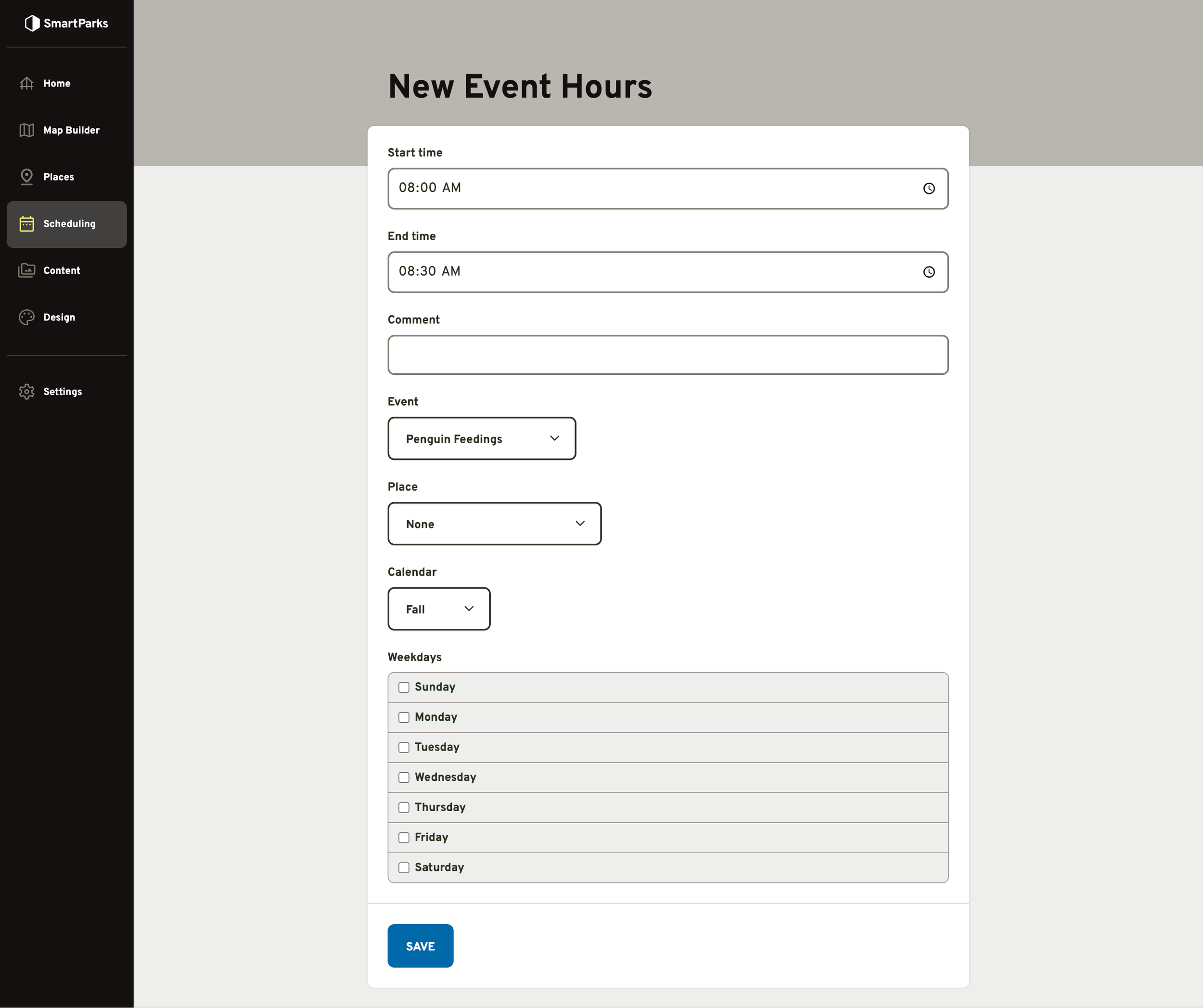 Weekdays: Event hours repeat on a weekly basis. You can select one or many days of the week that the event occurs. If you need an event to occur more than one time on a single day, then you should create multiple event hours for that event.
