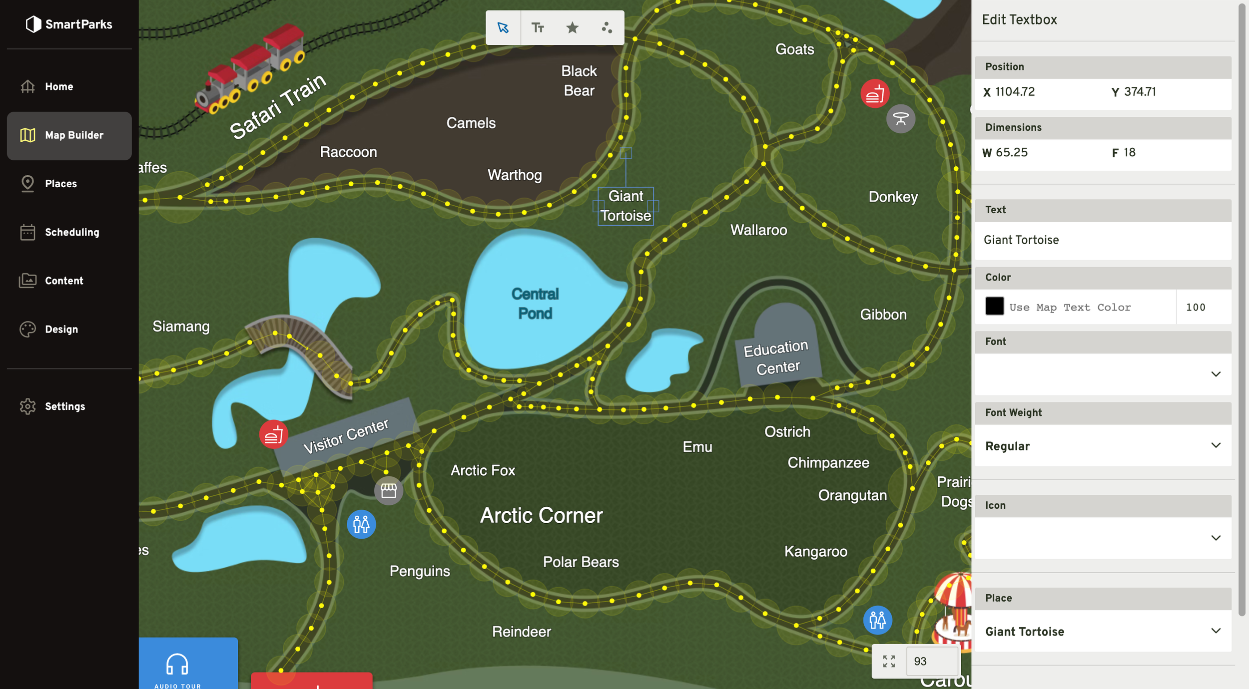 This feature allows you to build interactive maps with clickable labels and customizable walking paths. Maps are built on top of Map Templates. The map design tool is entirely web-based and does not require any specific technical knowledge to use.